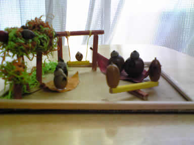 ←は、植木鉢の上に小皿をのせて、コーチンと拾ってきたマツボックリを